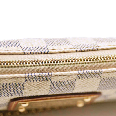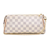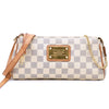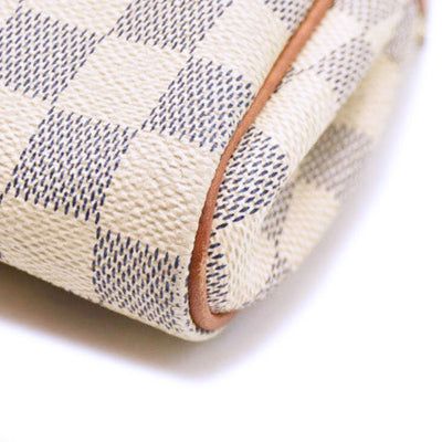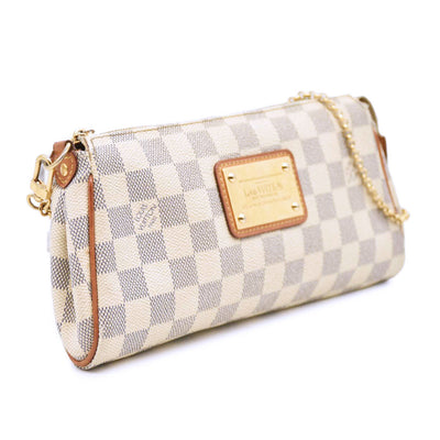 This is an authentic LOUIS VUITTON Damier Azur Eva Clutch. This chic clutch is crafted of Louis Vuitton's signature Damier coated canvas in white and blue. This versatile handbag features a polished gold plated chain-link wristlet strap, an optional vachetta leather shoulder strap, and a gold plated top zipper that opens to a beige canvas interior.