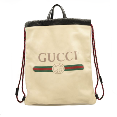 This is an authentic GUCCI Calfskin Logo Drawstring Backpack in Mystic White. This stylish backpack is crafted of off white calfskin leather with the Gucci name logo underlined by a green and red web stipe. The shoulder bag features black leather top handles and a drawstring. The side cording gathers around the top to cinch the backpack closed and opens to a spacious ivory suede interior.