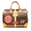 This is an authentic LOUIS VUITTON Monogram Summer Trunks Speedy Bandouliere 30. This stylish handbag is crafted of Louis Vuitton signature monogram canvas with a print of a Louis Vuitton luggage trunk with a red Louis Vuitton leather patch. The bag features rolled vachetta leather top handles, an optional leather shoulder strap, leather trim and polished brass hardware. The top zipper opens to a natural beige malletage fabric interior, and has a zipper pocket.