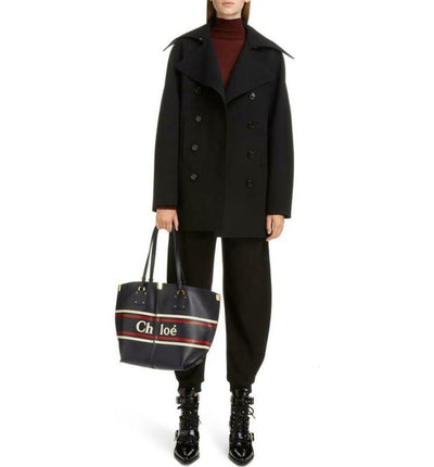 Chloe's Vick tote bag is composed of navy grained leather. This spacious accessory showcases a sporty dark red and white logo and stripes, a recurring motif from this season's collection.