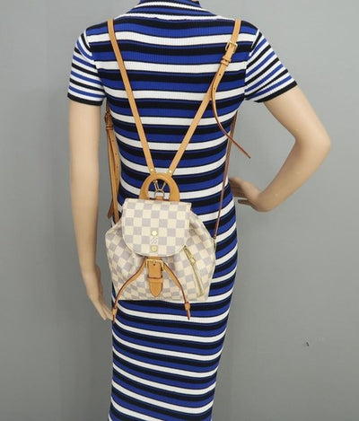We guarantee this is an authentic LOUIS VUITTON Damier Azur Sperone BB Backpack or 100% of your money back. This refined backpack is crafted of damier checkered canvas in blue and white. The backpack features vachetta shoulder straps, top handle, and cinch cord. The bag also features brass hardware, an exterior zip pocket and a crossover flap with a belt closure. The top opens to a light pink ballerine microfibre interior with a patch pocket. This is an ideal everyday backpack, from Louis Vuitton!