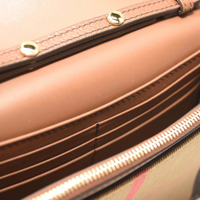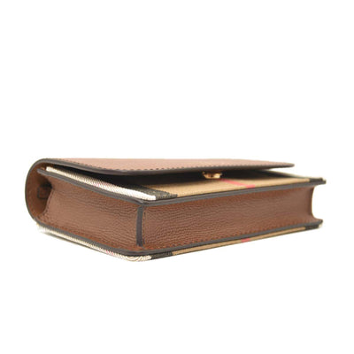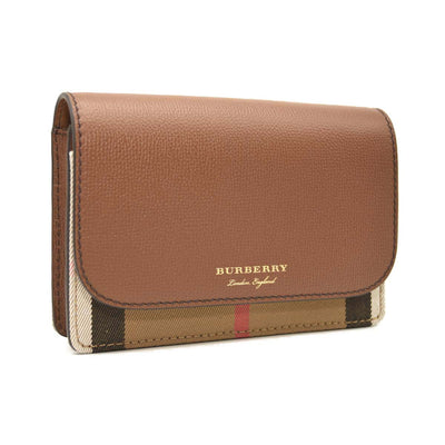 This is an authentic BURBERRY Derby Calfskin House Check Mini Hampshire Crossbody in Tan. This stylish bag is crafted of Burberry signature house check canvas and features a front flap in brown leather. This opens with a magnetic snap to a leather interior with card slots, a central zipper compartment, and bill pockets.