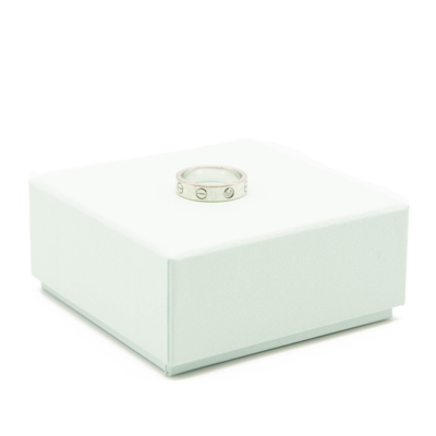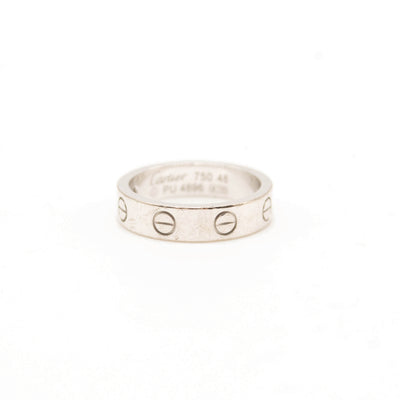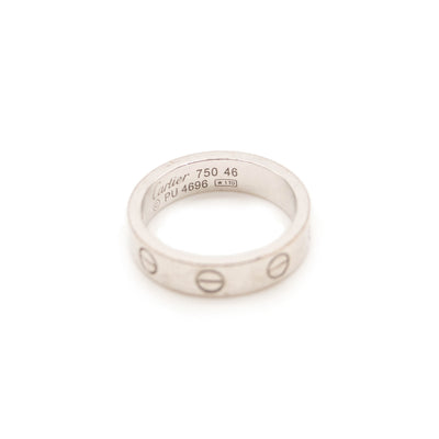 This is an authentic CARTIER 18k White Gold Diamond 4mm Wedding Band LOVE Ring 46 US 3.75. This classic 4mm band is 18 karat white gold and features the iconic cartier love symbol with a 0.03 karat diamond. This is a marvelous band from a special someone to a special someone only from Cartier!