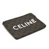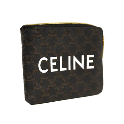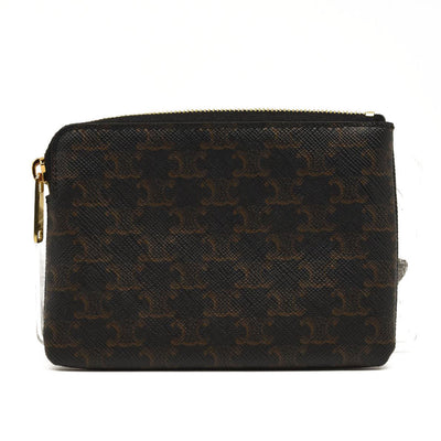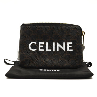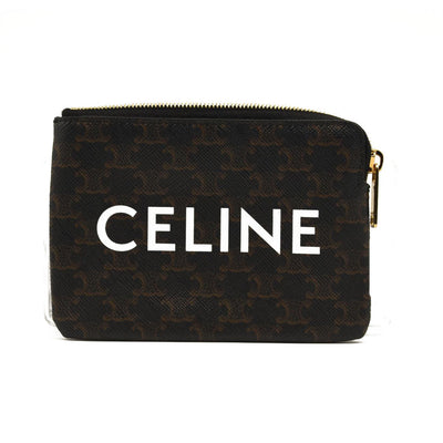 This is an authentic CELINE Triomphe Canvas Coin and Card Pouch With Hook in Black. This elegantly simple coin pouch is versatile and functional, and is crafted of textured coated canvas in black. This case features the Celine logo embroidered in gold, and a polished gold top zipper that opens to a tan fabric interior.