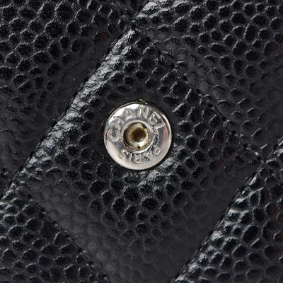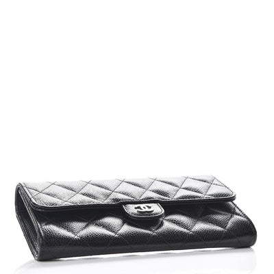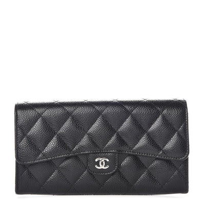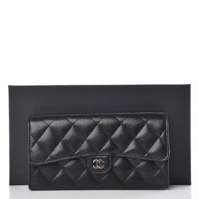 We guarantee this is an authentic CHANEL Caviar Quilted Large Gusset Flap Wallet Black or 100% of your money back. This is a chic clutch wallet is crafted of diamond quilted caviar leather in black. It features a front flap with a small polished silver Chanel CC logo. This opens with a snap to a burgundy fabric interior with card slot panels, patch pockets and a central zipper pocket. This exceptional wallet is as functional as it is stylish, from Chanel!