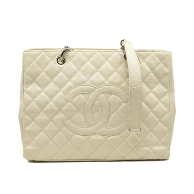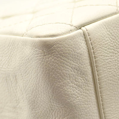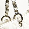 This is an authentic CHANEL Caviar Grand Shopping Tote GST White. This stunning tote is beautifully crafted of luxurious diamond quilted white caviar leather. The bag features shoulder straps with silver chain links threaded with leather and leather shoulder pads as well as a prominent frontal patch Chanel CC logo and a rear pocket. The top zipper opens to a white fabric interior with zipper and patch pockets. This is a marvelous tote that is ideal for day from Chanel!