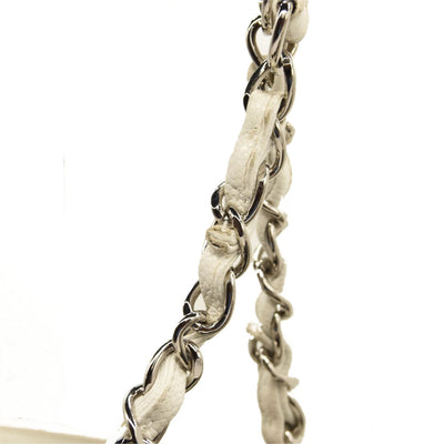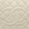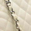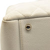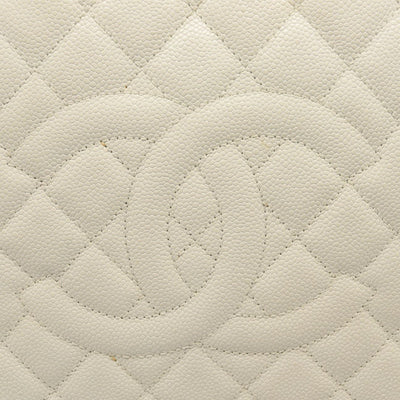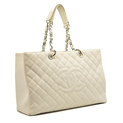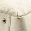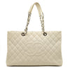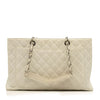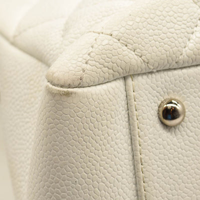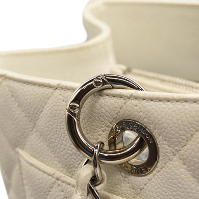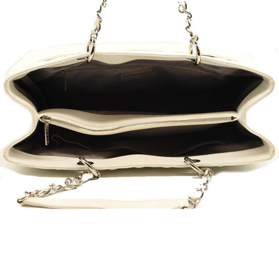 This is an authentic CHANEL Caviar Quilted Grand Shopping Tote GST in White. This tote is beautifully crafted of luxurious diamond-quilted caviar leather in off white. The bag features silver chain link leather-threaded shoulder straps with leather shoulder pads, a stitched Chanel CC logo on the front, and a rear patch pocket. The top is open to a partitioned beige fabric interior with zipper and patch pockets.