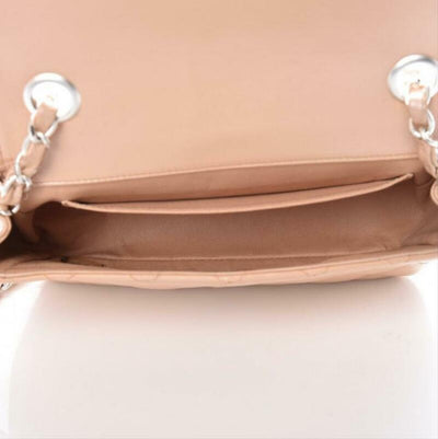 We guarantee this is an authentic CHANEL Lambskin Quilted Mini Rectangular Flap Beige or 100% of your money back. The chic little cross body classic is featured in soft lambskin leather with classic diamond shaped stitching in beige. The hardware includes a silver Chanel CC turn lock, and a classic leather threaded shoulder chain. The interior is leather lined and features a zipper pocket and patch pocket. This is an excellent evening bag or petite grab and go bag for just the essentials, by Chanel!