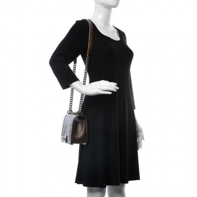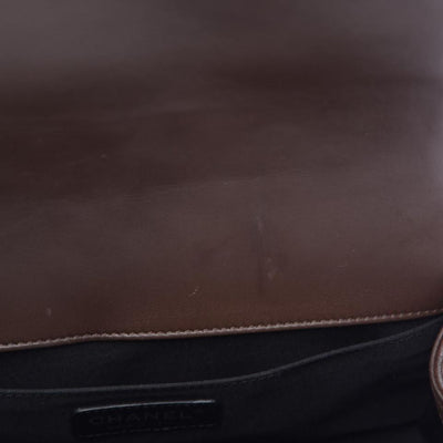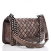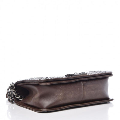We guarantee this is an authentic CHANEL Faded Calfskin Quilted Medium Studded Boy Flap Beige or 100% of your money back. This edgy shoulder bag is featured in distressed diamond quilted calfskin leather in brown. The bag features a frames quilting lined with polished dark metal studs, a ruthenium shoulder strap with a shoulder pad, and a ruthenium CC Boy press lock. This opens to a black fabric and leather interior. with a flat pocket. This bag is ideal for daytime or evening, with the chic appeal of Chanel.