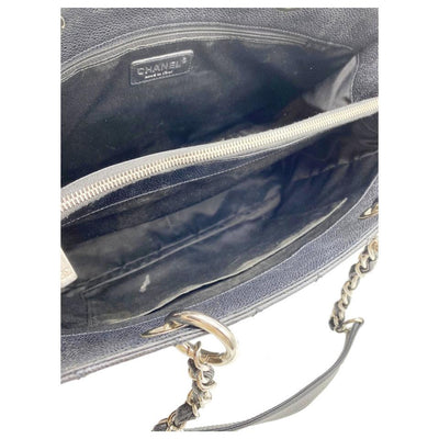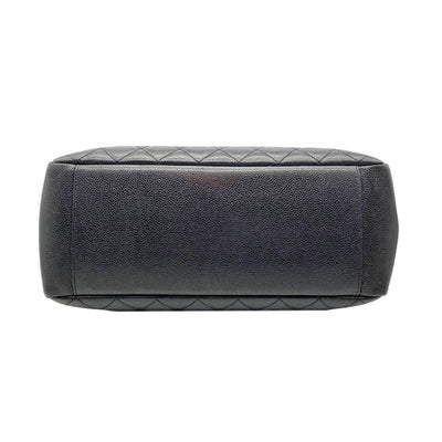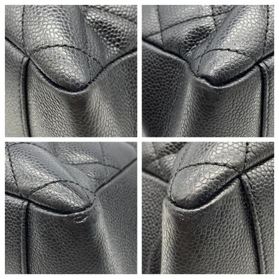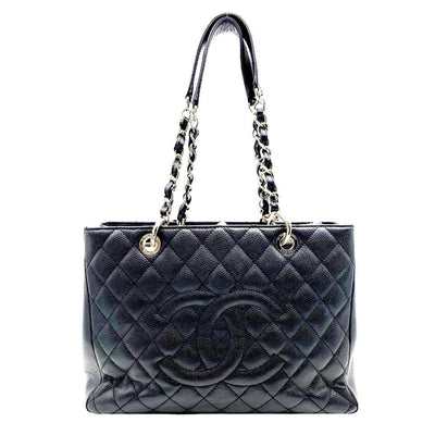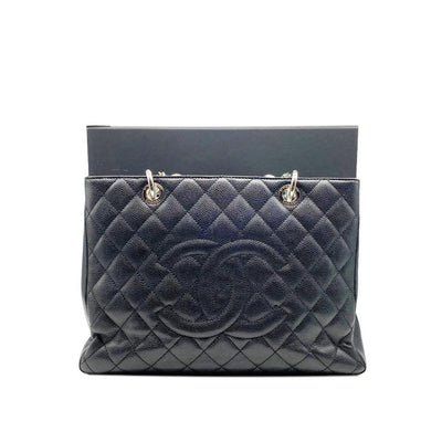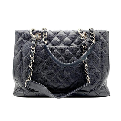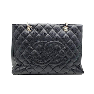 We guarantee this is an authentic CHANEL Caviar Quilted Grand Shopping Tote GST Black or 100% of your money back. This stylish tote is crafted of diamond quilted caviar leather in black. It features leather-threaded polished silver chain-link shoulder straps with shoulder pads, a prominent quilted Chanel CC logo on the front, and a flat pocket on the rear. The top opens to a partitioned black fabric interior, a central zippered section and zipper and patch pockets. This is a chic tote that is perfect for any occasion, only from Chanel!