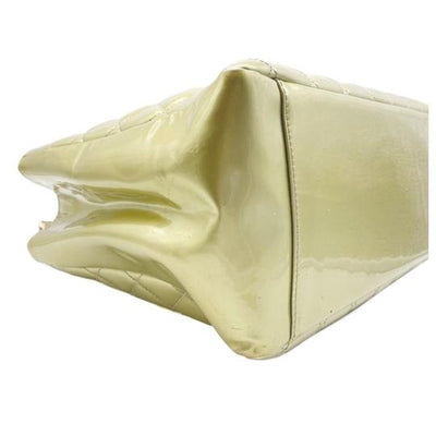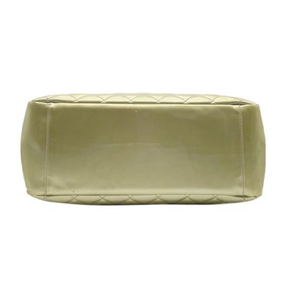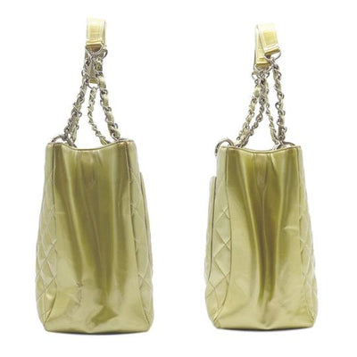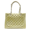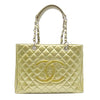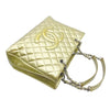 We guarantee this is an authentic CHANEL Patent Quilted Grand Shopping Tote GST Gold or 100% of your money back. This elegant tote is crafted of glossy patent leather in gold. The bag features patent leather-threaded chain shoulder straps, leather shoulder pads, silver hardware, an open top, and one outside flat pocket. The top is open to a grey fabric interior with a zipper center compartment and a zipper and patch pocket. This is a stylish bag for all your occasions from Chanel.