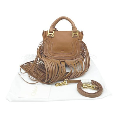 Chloe celebrates the 10th anniversary of the iconic Marcie bag with this special-edition mini version featuring lush fringe and a commemorative hot-stamped tag. Cut from small grain calfskin, the Marcie mini handbag blends a romantic and feminine aesthetic with a '70s folk spirit. Decorative saddle stitching, hand-wrapped leather handles and striking fringes add a folkloric touch, while the signature X handle attachments bring refinement and contrast to the Marcie handbag's laid-back appeal.