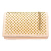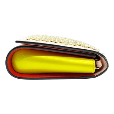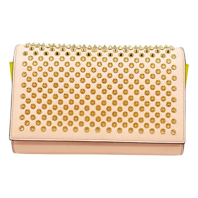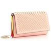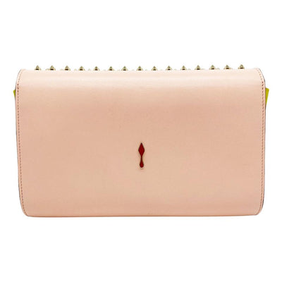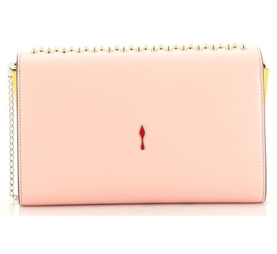 This Christian Louboutin Paloma Clutch Spiked Leather, crafted in multicolor, pink spiked leather, features spiked studs at front flap, chain-link shoulder strap, and gold-tone hardware. Its magnetic snap button closure opens to a red fabric and leather interior with multiple card slots and slip and zip pockets.