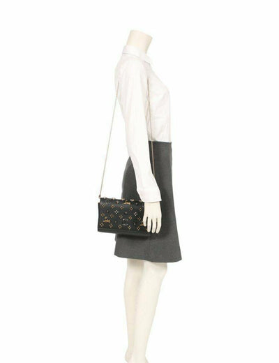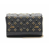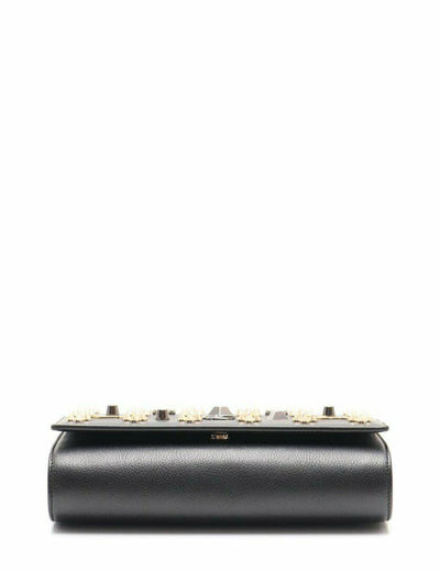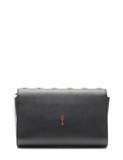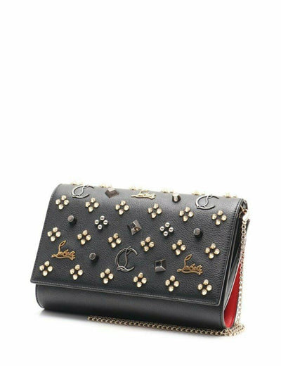 We guarantee this is an authentic CHRISTIAN LOUBOUTIN Calfskin Spikes Paloma Loubinthesky Clutch Black or 100% of your money back. This chic cross body bag is crafted of textured black leather with patent leather sides and an embellished flap. The bag features an optional gold chain shoulder strap with shoulder pad. The flap opens to a red interior with card slots, a zipper and patch pockets. Enjoy this shoulder bag with room for everyday essentials, with the forward fashion style of Christian Louboutin!