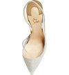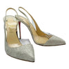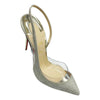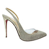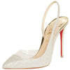 Panels of peekaboo PVC elevate the sultry appeal of a glitter-drenched slingback perched atop a lofty stiletto. Christian Louboutin's iconic red sole--born from a fateful brush with red nail lacquer--provides a standout color-pop foundation.