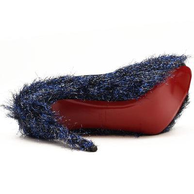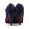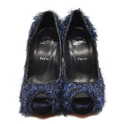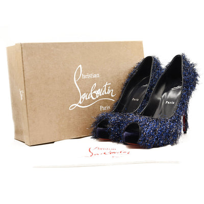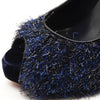 Lustrous velvet glitter defines this peep-toe design, subtly lifted by a hidden platform and stiletto heel.