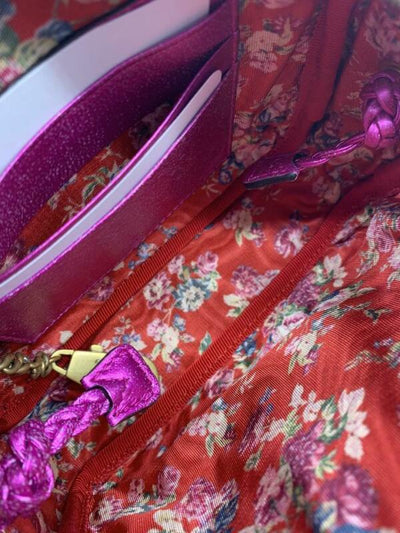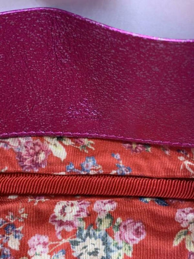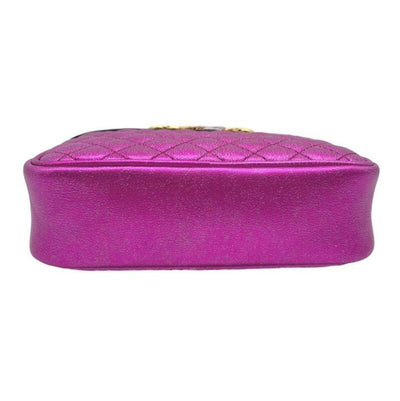 Supple leather in a shimmering fuschia hue is diamond quilted and braided on a chic camera bag set off with mixed-finish horsebit hardware. A floral-print moire lining beautifully finishes the look.