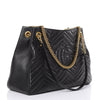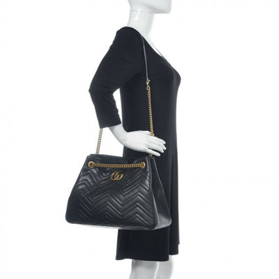 We guarantee this is an authentic GUCCI Calfskin Matelasse Medium GG Marmont Shoulder Bag Black or 100% of your money back. This bag is crafted of black calfskin leather. It features a long aged gold chain shoulder strap with a leather shoulder pad and a front interlocking GG logo. The top opens to a camel microfiber interior with zipper and patch pockets. This spacious shoulder bag is perfect for anytime of the day; whether it be for casual or formal wear, from Gucci!