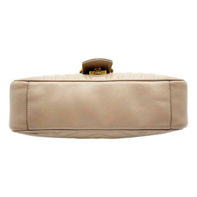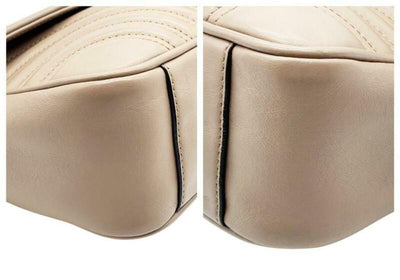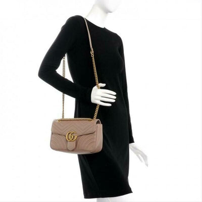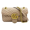 We guarantee this is an authentic GUCCI Calfskin Matelasse Small GG Marmont Shoulder Bag Nude or 100% of your money back. This shoulder bag is crafted of smooth & supple calfskin leather in beige. This bag features a long aged-gold chain shoulder strap with a leather shoulder pad. The front crossover flap features an interlocking GG logo that opens to a beige microfiber interior with a zipper pocket. This compact, yet spacious shoulder bag is perfect for anytime of the day; whether it be for casual or formal wear, from Gucci!