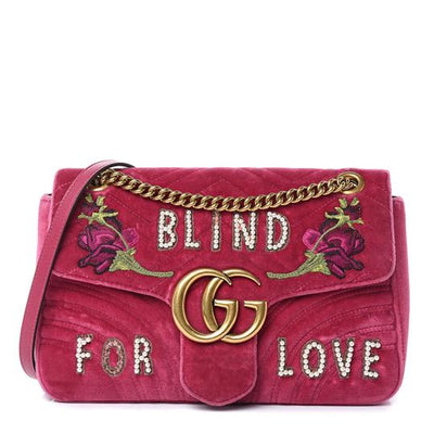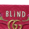 We guarantee this is an authentic GUCCI Velvet Embroidered Medium Blind For Love Marmont Shoulder Bag Pink or 100% of your money back. This shoulder bag is crafted of soft velvet in pink. The bag features eye-catching beading spelling the words "BLIND FOR LOVE" and an aged gold chain shoulder strap with a leather shoulder pad. The crossover flap has a prominent interlocking GG logo and opens to a blue satin fabric interior with zipper and patch pockets. This spacious shoulder bag is perfect for every day, from Gucci!