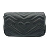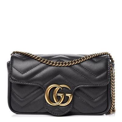 We guarantee this is an authentic GUCCI Calfskin Matelasse Super Mini GG Marmont Black or 100% of your money back. This shoulder bag is crafted of smooth calfskin leather in black. This bag features an optional aged gold chain shoulder strap, and an interlocking aged gold GG logo on the front. The flap opens to a beige microfiber interior with an attached key ring. This compact, yet spacious shoulder bag is perfect for anytime of the day only from Gucci!