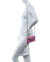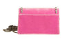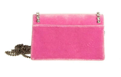 We guarantee this is an authentic GUCCI Velvet Crystal Super Mini Dionysus Bag Pink or 100% of your money back. This petite bag is crafted of soft velvet in pink. This shoulder bag features a matte silver chain shoulder strap, a textured horseshoe tiger spur closure, and a crystal lined bordering. The double flap opens to an emerald satin interior with a key ring that can attach to a larger bag. This is a chic shoulder bag for just the essentials, with the sophistication and style from Gucci!