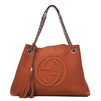 We guarantee this is an authentic GUCCI Nubuck Medium Soho Chain Shoulder Bag Old Whiskey or 100% of your money back. This orange shoulder bag is crafted of fine suede leather with a large stitched frontal GG Gucci logo. The bag features a light gold chain link shoulder straps. This opens to a natural linen interior with a zipper and patch pocket. This is a stylish bag for day or evening essentials with the sophisticated style from Gucci!