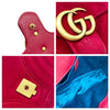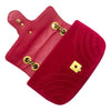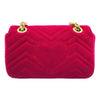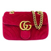 We guarantee this is an authentic GUCCI Velvet Matelasse Mini GG Marmont Red or 100% of your money back. This shoulder bag is crafted of velvet in a classic cherry red. This elegant bag features a long aged gold chain shoulder strap with a black leather top strap. The front crossover flap features an interlocking GG logo that opens to a pink satin interior with a patch pocket. This compact, yet spacious shoulder bag is perfect for anytime of the day; whether it be for casual or formal wear, from Gucci!