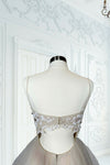 Beautifully beaded floral appliques sparked with watery crystals focus attention at the fitted sweetheart bodice of an ethereal tulle gown. Suspended from delicate lingerie straps and designed with a pretty back cutout, the dreamy style culminates in a voluminous skirt of cascading, horsehair-trimmed layers.