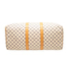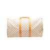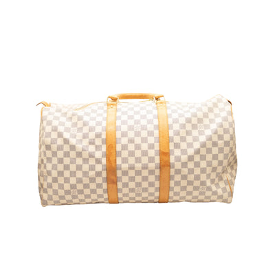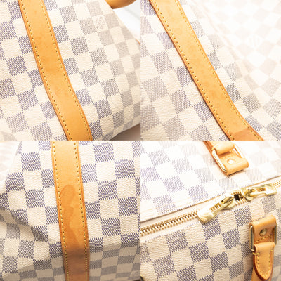 This is an authentic LOUIS VUITTON Damier Azur Keepall 50. This bag is crafted of signature damier checkered canvas in azure blue and white. It features rolled vachetta leather top handles and piping trim with brass hardware. The top zippers open to a spacious beige fabric interior.