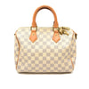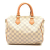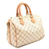 This is an authentic LOUIS VUITTON Damier Azur Speedy Bandouliere 25. This stylish handbag is crafted of Louis Vuitton's signature Damier Azur canvas. This shoulder bag features vachetta leather rolled top handles, an optional adjustable shoulder strap, matching trim, and polished gold hardware. The top zipper opens to a beige fabric interior with a pocket.