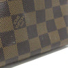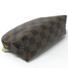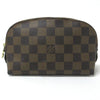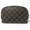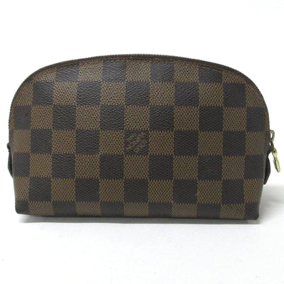 This is an authentic LOUIS VUITTON Damier Ebene Cosmetic Pouch PM. This practical pouch is ideal for holding all your essentials with its sturdy zipper and spacious interior. -Damier ebene canvas -Wrap around brass zipper -Red cowhide leather interior -Patch pockets