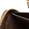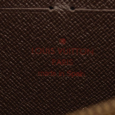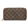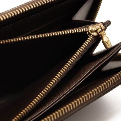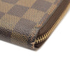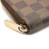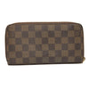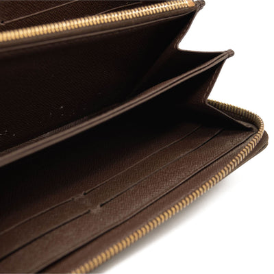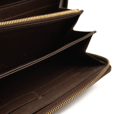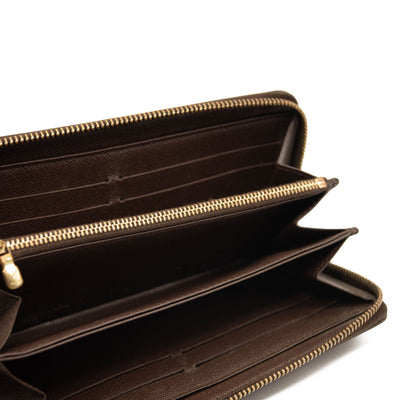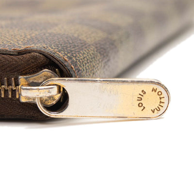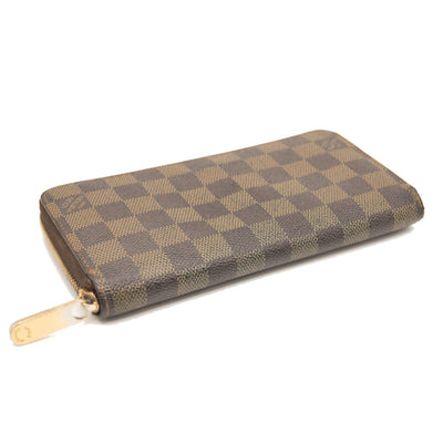 This is an authentic LOUIS VUITTON Damier Ebene Zippy Wallet. This wallet is crafted of Louis Vuitton's signature Damier check canvas in brown. The wallet features a brass three-sided zipper that opens to a dark brown cross-grain leather interior with card slots, patch pockets, and a zipper compartment.