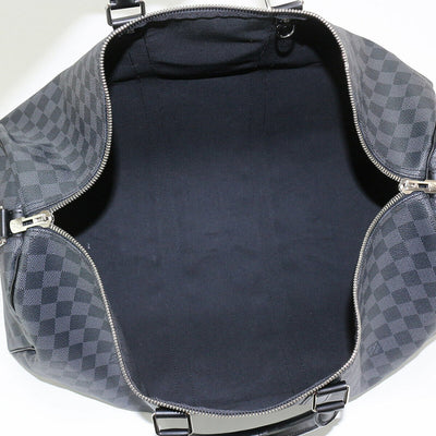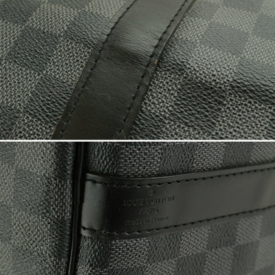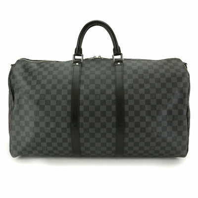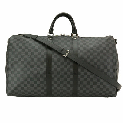 We guarantee this is an authentic LOUIS VUITTON Damier Graphite Keepall Bandouliere 55 or 100% of your money back. This spacious travel piece is crafted of graphite damier canvas and features matching cowhide smooth rolled leather handles, an optional shoulder strap, and side trim with silver hardware. The full length zipper opens to a canvas fabric interior. This is an ideal bag for travel needs that call for style and superior function, from Louis Vuitton.