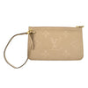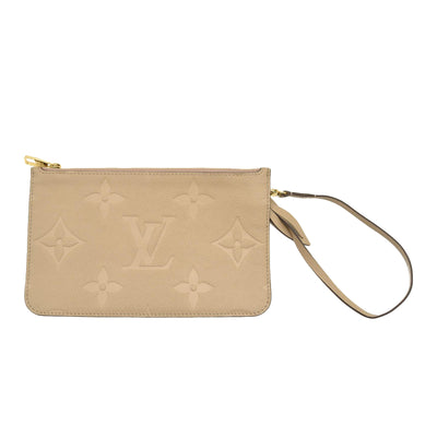 This is an authentic LOUIS VUITTON Empreinte Monogram Giant Neverfull MM Pochette in Tourterelle. This embossed monogram leather pouch features a wristlet strap, which can connect to the D-ring inside a Neverfull as an accessory. This pochette opens with a polished brass top zipper to a dark brown interior.