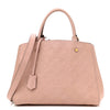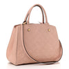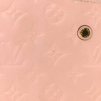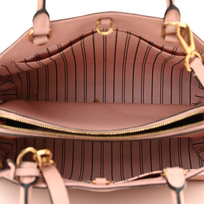 This is an authentic LOUIS VUITTON Empreinte Montaigne MM in Rose Poudre. This chic tote is crafted of Louis Vuitton monogram embossed leather in light pink. The bag features rolled leather top handles with polished brass links, an optional leather shoulder strap with brass clasps, and a broad open top. This bag includes a padlock, keys, and hanging clochette. The top is open to a pink fabric interior with a central zipper pocket.