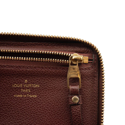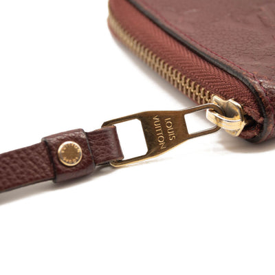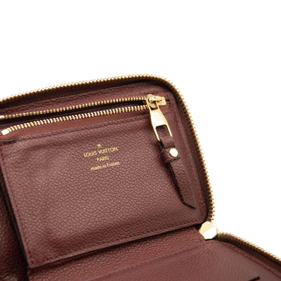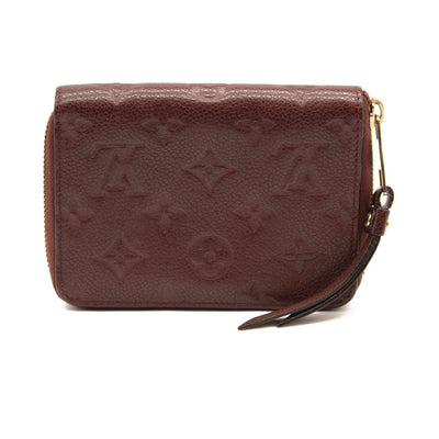 This is an authentic LOUIS VUITTON Empreinte Zippy Coin Purse in Burgundy. This wallet is made of monogram embossed calfskin leather in burgundy. The wallet unzips to a burgundy leather lining with accordion like gusseted sides. The interior has card slots and patch pockets.