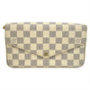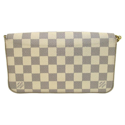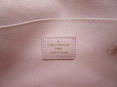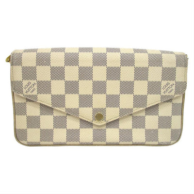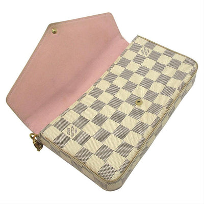 We guarantee this is an authentic LOUIS VUITTON Damier Azur Pochette Felicie Chain Wallet Rose Ballerine or 100% of your money back. This stylish wallet is crafted of classic Louis Vuitton damier azur toile coated canvas. The wallet features a structured base and a lovely gold chain link strap. The envelope style front facing flap opens to a light pink fabric interior with a patch pocket. This is a beautiful shoulder bag that is practical for daily use with the luxury and style only from Louis Vuitton!