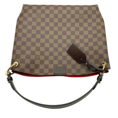 We guarantee this is an authentic LOUIS VUITTON Damier Ebene Graceful PM or 100% of your money back. This stylish shoulder bag is crafted of Louis Vuitton signature damier coated canvas in brown. The bag features a flat brown leather shoulder strap, polished brass hardware, and opens to a spacious rouge red fabric interior with a zipper pocket. This is an excellent shoulder bag, ideal for everyday essentials, with the luxury and style of Louis Vuitton!