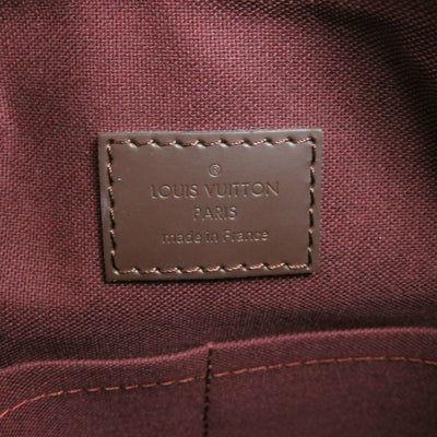 We guarantee this is an authentic LOUIS VUITTON Damier Ebene Iena MM or 100% of your money back. This stylish tote is crafted of Louis Vuitton damier on toile coated canvas in brown. The bag features a front zipper pocket, and dark brown leather trim and shoulder straps, with polished brass hardware. The top zipper opens to a plum purple fabric interior with patch pockets. This is a perfect bag for everyday use, with the luxury and style of Louis Vuitton!