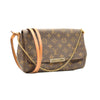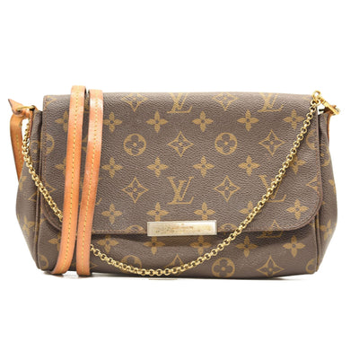 This is an authentic OUIS VUITTON Monogram Favorite MM- NEW. This stylish wrist bag is crafted of Louis Vuitton monogram coated canvas. The bag features a short gold chain end to end wrist strap and a cross over flap. This opens to a plum fabric interior. This is an excellent baguette, ideal for everyday essentials, from Louis Vuitton!