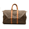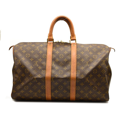 This is an authentic LOUIS VUITTON Monogram Keepall 45. This stylish duffel is crafted of monogram coated canvas. It features vachetta leather top handles and brass hardware. The top zippers open to a cocoa brown fabric interior.