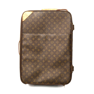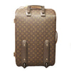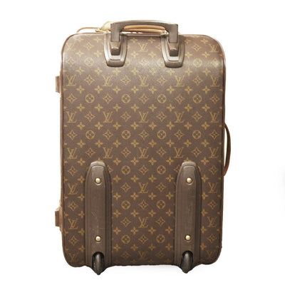 This is an authentic LOUIS VUITTON Monogram Pegase 55. This suitcase is crafted of durable Louis Vuitton monogram on toile canvas, with vachetta cowhide leather trim, top and side handles. The bag features a wide front pocket and a telescopic handle for wheeling the suitcase on the ground. The gold wrap-around zippers open the bag to a cocoa brown fabric interior.