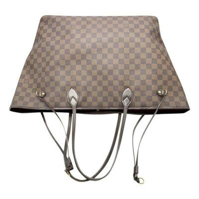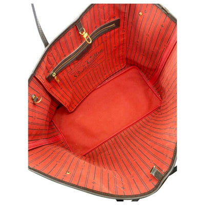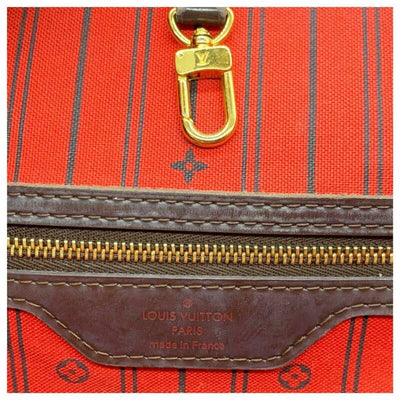 We guarantee this is an authentic LOUIS VUITTON Damier Ebene Neverfull GM or 100% of your money back. This chic handbag is crafted of classic Louis Vuitton damier checkered canvas with dark brown cowhide leather top shoulder straps and trim. This shoulder bag opens to an interior of rouge red striped fabric with a hanging zipper pocket. This is a wonderful tote that is ideal for all of your everyday needs, with luxury and style, by Louis Vuitton!