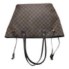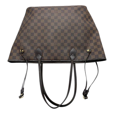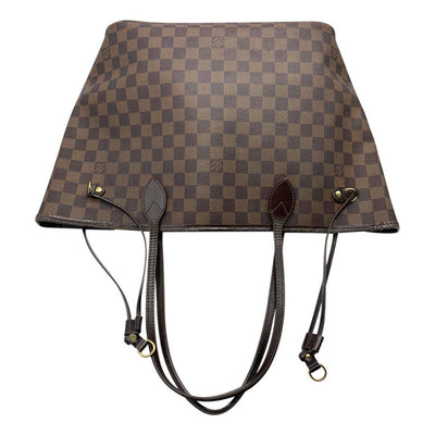 We guarantee this is an authentic LOUIS VUITTON Damier Ebene Neverfull MM or 100% of your money back. This chic handbag is crafted of classic Louis Vuitton damier checkered canvas with chocolate brown cowhide leather top shoulder handles and trim. This bag opens to an interior of rouge red striped Louis Vuitton logo fabric with a zipper pocket. This is a wonderful tote that is ideal for all of your everyday needs with the special accent of luxury and style, from Louis Vuitton.