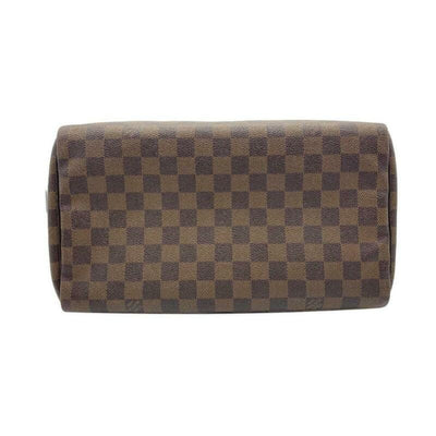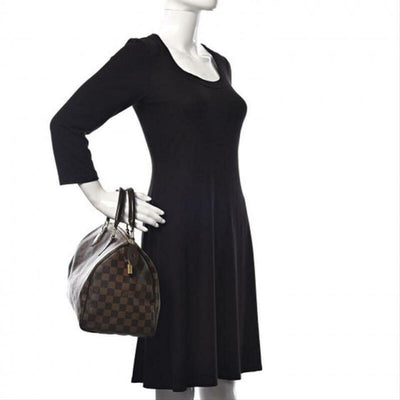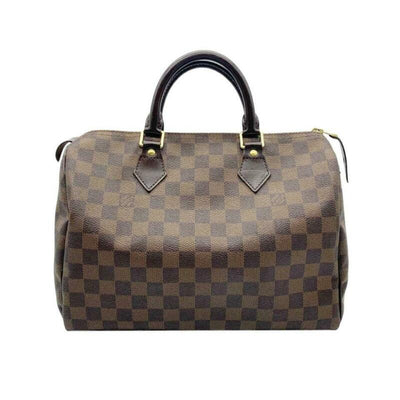 We guarantee this is an authentic LOUIS VUITTON Damier Ebene Speedy 30 or 100% of your money back. This stylish tote is crafted of Louis Vuitton damier coated canvas in brown. The bag features chocolate brown leather trim and rolled top handles, with polished brass hardware. The top zipper opens the bag to a red fabric interior with a hanging patch pocket. This is an ideal tote for everyday use, from Louis Vuitton!