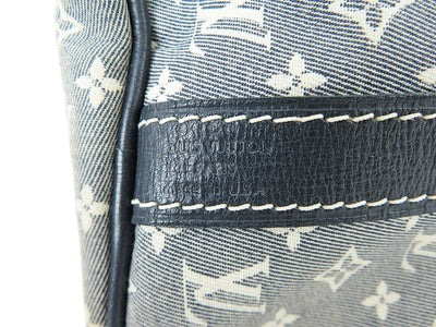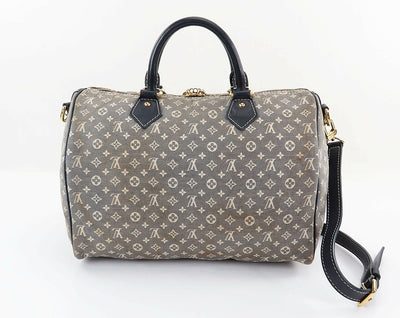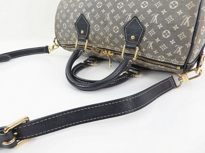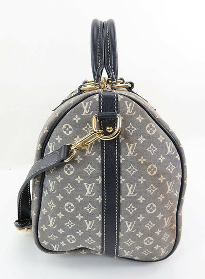 We guarantee this is an authentic LOUIS VUITTON Speedy Bandouliere 30 Blue Idylle Boston Shoulder Bag or 100% of your money back. This Speedy is crafted of a supple, light and very durable blue fabric with ivory mini monogram. This fabulous Speedy has all of the other classic features including matching blue leather piping at the sides, rolled leather top handles with anchors and polished gold brass handle links. There is a polished gold top zipper that opens to a matching fabric interior with patch pockets. This is an excellent tote for everyday use, from Louis Vuitton!