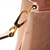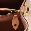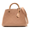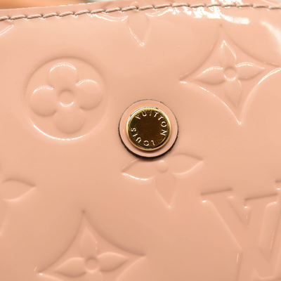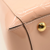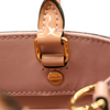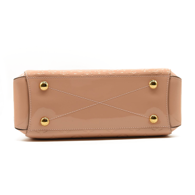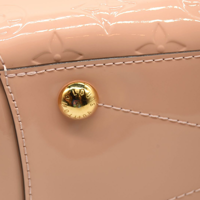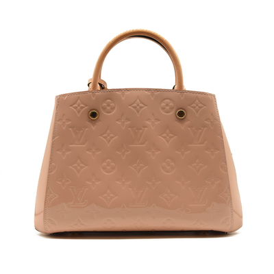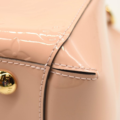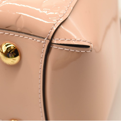 This is an authentic LOUIS VUITTON Vernis Montaigne BB in Rose Ballerine. This small chic tote is crafted of Louis Vuitton monogram Vernis in light pink. The bag features rolled top handles and an optional patent leather shoulder strap with brass clasps. The top opens to a partitioned pink fabric interior with a central zipper pocket and patch pockets.