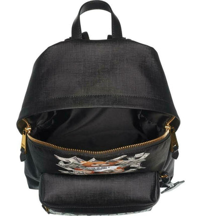 An Italian backpack corners the market in style with Moschino's mascot bear, a windfall of bills and logo lettering at the exterior zip pocket and straps.