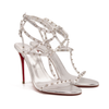 Silvery spikes max out the shine of this nappa-leather sandal featuring a T-stap silhouette that's extended with criss-crossing straps that buckle at the ankle. 3 3/4" (95mm) heel Adjustable straps with buckle closure Wipe with a soft, dry cloth and store in a dust bag Please note the red lacquer on soles will wear off as a result of normal use. To minimize the effect, avoid wearing in wet weather or on abrasive surfaces Leather upper, lining